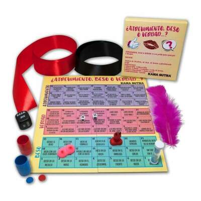 Players roll the dice and choose where to come from. There are three outputs KISS, TRUTH and DARE. All players have to pass all exits. Each box has a test and you have to do what it says in the box with the player you want and if you land on an object box, you have to use it. Each turn has the time counted, the hourglass marks 2 minutes. The player who refuses to take the test will pay with an item of clothing that they are wearing.