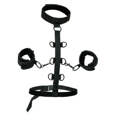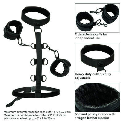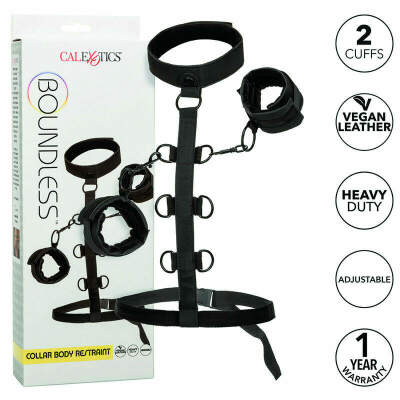 Expand the limits of pleasure and enjoy endless bondage possibilities with the CalExotics Boundless Collar body restraint system. Put on this daring restraint and explore passionate play with the universal vegan leather cuffs, sturdy collar, and multi-level restraint strap. Fetishists and shy beginners alike can enjoy passionate pleasure play slipping into the wickedly sexy restraints and padded faux leather cuffs. Once youve wrapped this beautiful sinful collar around your neck, your dominant will delight in it. You will learn to use multiple levels of restraints to command and control your pleasure. The plush vegan leather cuffs are equipped with a heavy-duty universal closure with a swivel design to give your pleasure a full range of motion. Plus, the detachable grips can be used independently for more adventures. Even those newer to submissive play will love it. The exciting comfort of the luxurious inner collar layer and the double-padded, double-stitched cuff design. Make your most erotic dreams come true and immerse yourself in your most adventurous desires with this sensationally comfortable body restraint collar.