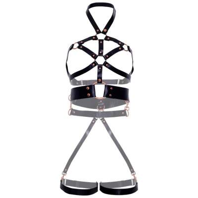Explore your most intimate desires with a touch of daring elegance as you bask in the delight and authority of our vegan leather O-ring studded body harness. The alluring O-ring studs ;rich, the connected garters and removable back strap reveal the adventurous side of your personality, inviting you on an enchanting journey towards sensual control.