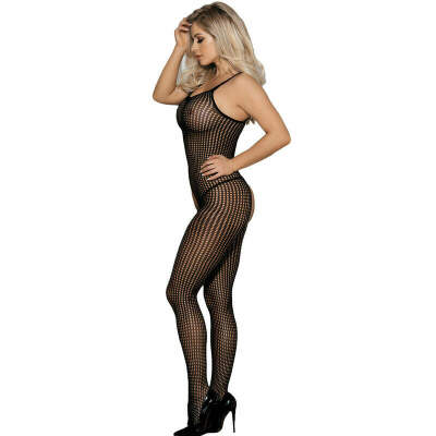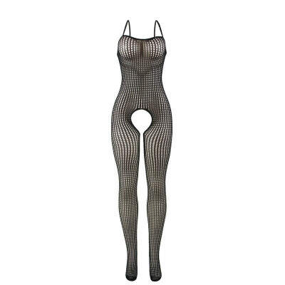 - Style: Black elastic fishnet bodystocking with crotchless design (open crotch).