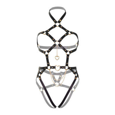 Convertible harness teddy in vegan leather with golden heart rings and chains, studs, a snap-off panty and adjustable straps.