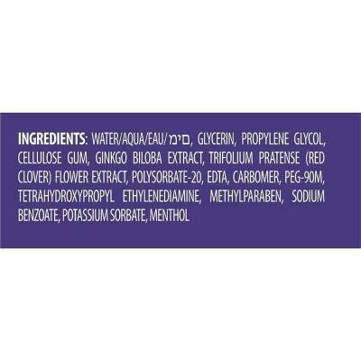 water, glycerin, propylene glycol, cellulose gum, ginkgo biloba extract, trifolium pratense (red clover) flower extract, polysorbate-20, EDTA, carbomer, PEG-90M, tetrahydroxypropylethylenediamine, methylparaben, sodium benzoate, potassium sorbate, menthol
