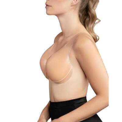 Clear your skin of any oil and creams. Once done, dry your skin with a soft towel. Remove the protective film from the cup and the transparent strap. Flip the cup outward while holding the transparent tape by its end with one hand. Position the cup at the desired breast angle and gently press the cup edges with your fingertips. Then pull the transparent strap in an upward direction over your shoulder. When the desired position is achieved, stick the strap to the skin. Repeat the same procedure with the other breast. Press both cups firmly on the breasts for an optimal adhesive effect.