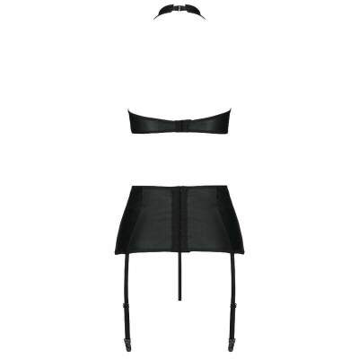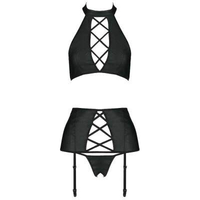The Nancy Set is a three-piece set from Passion, featuring a halter top, garter belt, and boldly cut thong. All this is made of black leather, which is decorated with numerous crossed stripes that reveal feminine qualities.