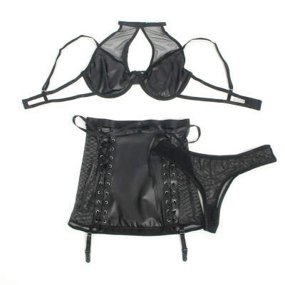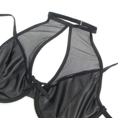 This PU leather and translucent mesh lingerie set creates a perfect balance between provocation and elegance. The halter design highlights the shoulders and neckline in a striking way, while the vinyl material gives it a touch of rebellion and power. Mesh details add strategic sheer detailing that hints at skin in a seductive way, fusing daring with sophistication.