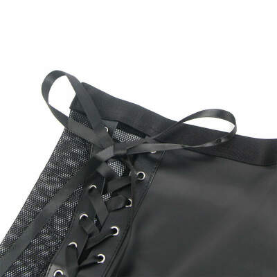 This PU leather and translucent mesh lingerie set creates a perfect balance between provocation and elegance. The halter design highlights the shoulders and neckline in a striking way, while the vinyl material gives it a touch of rebellion and power. Mesh details add strategic sheer detailing that hints at skin in a seductive way, fusing daring with sophistication.
