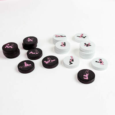 - 42 pieces (21 white pieces and 21 black pieces) each with a different Kama Sutra position.