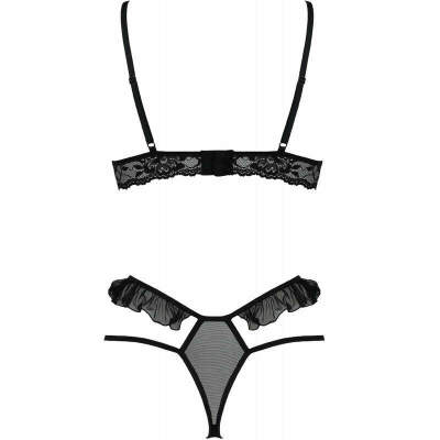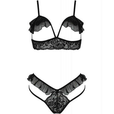 Erotic lingerie can fully highlight the beauty of the female body. The model presented is a Passion set, which includes a bra with open cups and a thong. Everything is made of tulle and black lace