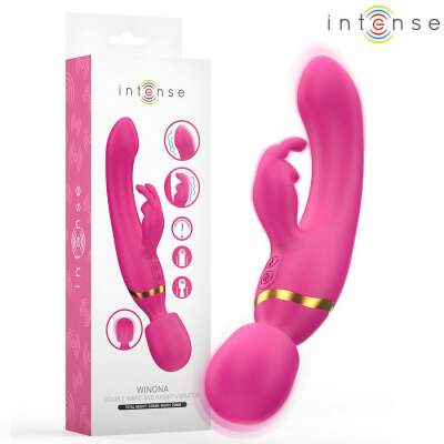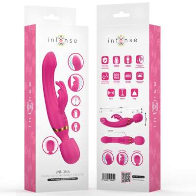Winona Rabbit & Wand double vibrator by Intense is the perfect fusion of technology, design and pleasure. Its innovative 2-in-1 format combines a rabbit-type stimulator with a powerful wand-type vibrator, offering a complete experience to satisfy all your fantasies. Whether for stimulation of the G-spot, the clitoris, or any other erogenous zone, Winona has been designed to adapt to your desires and accompany you in every moment of pleasure.