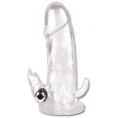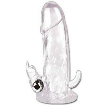 This penis extension sleeve has a solid tip to give you that extra length whenever you want it. Use the bullet on top to stimulate your clitoris or use it on the bottom to stimulate your balls. Supplied with batteries. One size fits most.