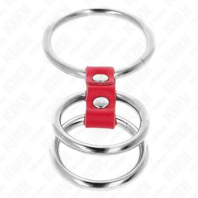 KINK - TRIPLE METAL PENIS RING 3.7 CM TO 5 CM CONNECTED WITH RED LEATHER