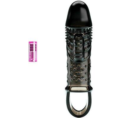 Have fun with this vibrating penis sleeve. This erection-enhancing and pleasure-promising penis sleeve is made of soft TPR and is secured in place by a ball loop. A vibrator at the tip extends the length of your penis and is activated on contact. By stimulating the head of your shaft, you also provide internal stimulation for her. The stretchy sleeve wraps around your penis for a stronger, longer-lasting erection, giving you more time to enjoy the vibrations!