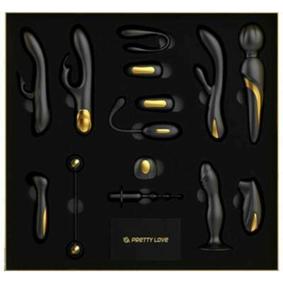 Kit de Lujo Negro & Oro que incluye 12 juguetes con vibración, lamido, succión, control remoto inalámbrico y juguetes de electroestimulación. Muchos están adornados con adornos de oro de 18k o 24k. Todos los juguetes son de silicona y los juguetes vibradores son recargables por USB.