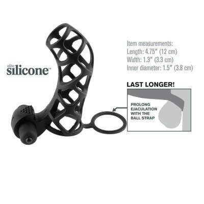 The Extreme Silicone Power Cage is the ultimate erection enhancer! With this cock cage wrapped snug around every inch of your manhood, you'll maintain rock hard erections and prolong the fun while you stimulate your partner. The ball strap prolongs ejaculation for explosive climaxes, while the cage leaves your cock open to feel every sensation and still enjoy the natural touch of your lover. You'll enjoy thick, throbbing erections and your partner will love the cage's added sensations. The vibrating clit stimulator delivers direct stimulation to their most sensitive spot. Just one click of the powerful waterproof micro vibe and you'll make them cum harder than ever before!