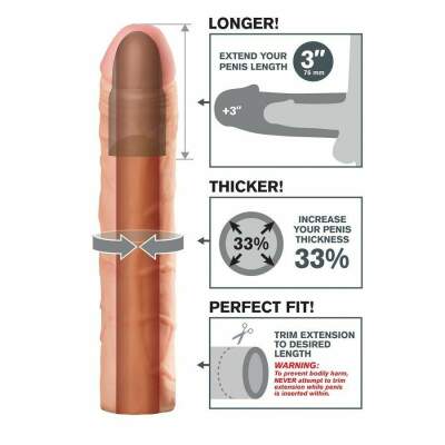 The Perfect 3″ Extension is a customizable extension that can be easily trimmed at the base for a perfect fit. It's super-stretchy to accommodate most sizes and snug enough to help you last longer. Your partner will enjoy deeper penetration with the 3″ extension at the tip, while the ultra-lifelike shaft makes you 33% thicker all around. The soft Fanta Flesh material feels just like a second skin, giving you the length, girth, and confidence you need to satisfy your lover.