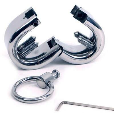 Oval shaped metal testicle cuff designed to fit perfectly around the scrotum between the base of the penis and the testicles. With four screws to apply pressure that can be adjusted with the included allen key and with a ring to attach and complete other fetish games.