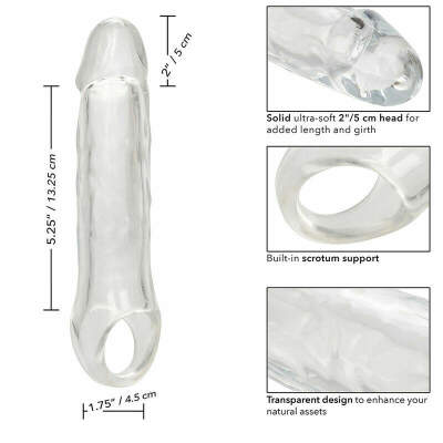 Experience elevated pleasure with the Performance Maxx Clear Extension 7.5". This extension increases your size and confidence, offering additional length and thickness. With an ultra-soft 2-inch/5cm solid head, it provides a realistic feel, and the transparent design visually stimulates, showing off your natural attributes. The realistic hollow design is comfortable, with a built-in scrotum strap for stability during use. Made with body-safe, fragrance-free and phthalate-free materials, it ensures peace of mind. Whether adding excitement to intimate encounters or exploring new sensations, the Performance Maxx Clear Extension 7.5" enhances experiences and helps reach new levels of pleasure.