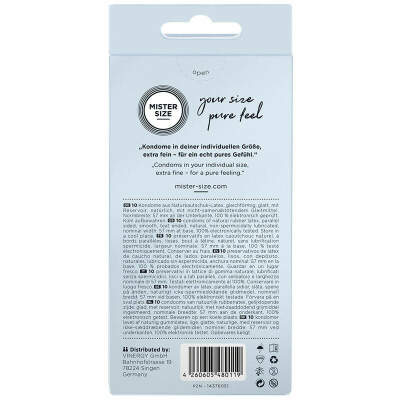 Sometimes, the standard just isn't enough. When putting on a condom, you've probably already experienced the annoyance of it not fitting quite right. No wonder you haven't found your personal size yet. But from now on, you can always carry MISTER SIZE 57 with you. Now that the chemistry is right, you can experience how light sex can be.