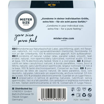 MISTER SIZE gives you a completely new sensation during sex while offering optimal safety. All our MISTER SIZE condoms comply with DIN EN ISO 4074:2002 and are subject to thorough testing. Having a condom with optimal safety generates confidence and security that allows both partners to relax and let themselves go completely during the sexual act.