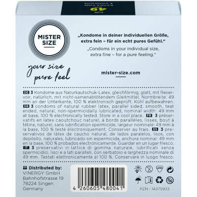 Our MISTER SIZE 49 is the ideal companion for your sensitive and elegant penis. Working together they will create wonderful moments of great ecstasy. You really don't need a powerful beast to fully enjoy the moment or move mountains, just the right sensations for those intimate touches that send shivers of pleasure through your body. MISTER SIZE 49 gives you protection without wasting a single nuance of sensation.