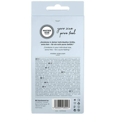 MISTER SIZE gives you a completely new sensation during sex while offering optimal safety. All our MISTER SIZE condoms comply with DIN EN ISO 4074:2002 and are subject to thorough testing. Having a condom with optimal safety creates confidence and security that allows both of you to relax and let yourself go completely during sex.