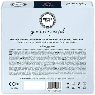 With MISTER SIZE 64 you have the condom that gives you a pleasant feeling in every sense. Pinching, pinching and the feeling that your manhood is being suffocated are a thing of the past! From now on, pure pleasure begins. Just before making love, a wonderful union is created by easily pulling the condom onto your strong and robust penis - a union that will create wonderful moments of sensual pleasure. Easy and perfect fit with your personal condom size No matter what has happened in the past, a condom can and should always fit perfectly! With your personal size, your MISTER SIZE condom warmly embraces your penis like a second skin and makes a natural feeling possible. You can now relax and finally let yourself go completely during sex.
