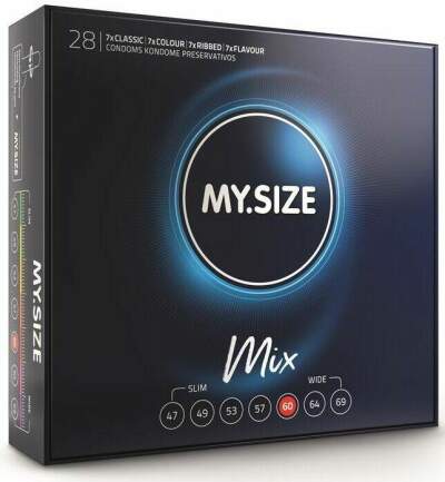 - THE DEAL: 28 MY.SIZE condoms in 4 variations: 7 Classic, 7 Ribbed, 7 Flavor, 7 Color. 60 mm. CE marking. In compliance with EU Directive 93/42/EEC on medical devices. Available in other nominal widths. Free online gauging app included.