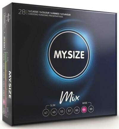 - THE DEAL: 28 MY.SIZE condoms in 4 variations: 7 Classic, 7 Ribbed, 7 Flavor, 7 Color. 64 mm. CE marking. In compliance with EU Directive 93/42/EEC on medical devices. Available in other nominal widths. Free online gauging app included.