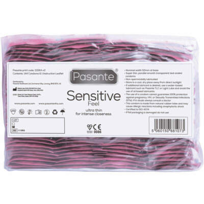 Pasante Sensitive Feel condoms are ultra-thin for intense contact. Smooth, parallel, natural color and with a teat tip. Each condom is Made with a thickness of 0.053 microns, up to about 25% thinner than regular condoms.