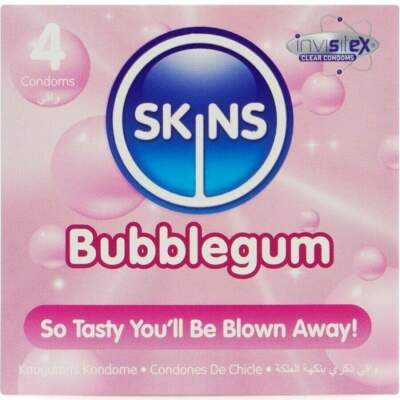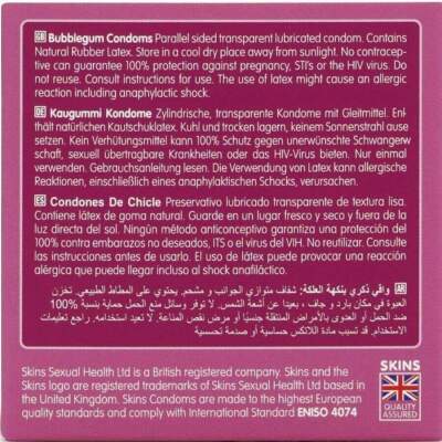 4-Pack of Skins Bubblegum Blow Me! Condoms Give them a touch of excitement with the tempting fruity bubblegum scent. The high-quality latex is infused with the scent of bubblegum, for a long-lasting, delicious aroma that adds a whole new sensation to sex. Skins condoms are stronger, thinner, and more lubricated than most. This means they feel like a second skin and are less likely to break. Skins are not only the best for sensation and pleasure, but also one of the safest condoms on the market.