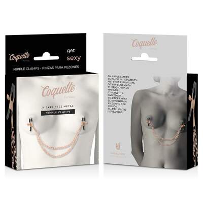 These chain nipple clamps from Coquette Chic Desire! They are unisex and very easy to use. The clips and chain are made of nickel-free metal. They do not contain nickel. You can use the nipple clamps for your naughty secrets or as a stimulating accessory while penetrating your lover.