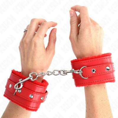 KINK - PREMIUM FUR LINED WRIST RESTRAINTS RED WITH RED BELT ADJUSTABLE 17-29 CM X 6 CM